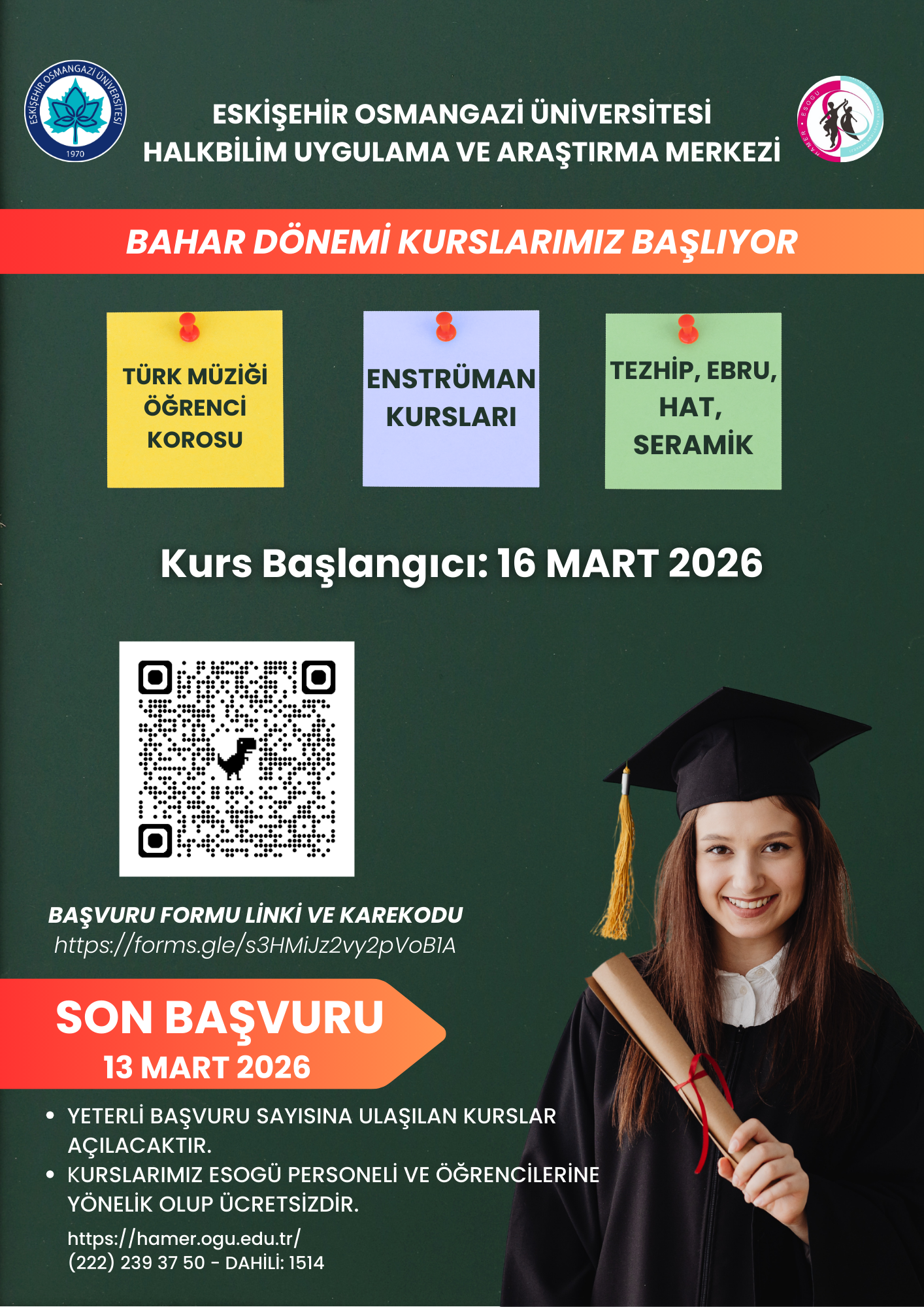 Eskişehir Osmangazi Üniversitesi Halkbilim Uygulama ve Araştırma Merkezi (HAMER) tarafından düzenlenen 2025-2026 Bahar Dönemi kurslarımız başlıyor. Geleneksel sanatlarımızı yaşatmak ve öğrencilerimizin kültürel, sanatsal gelişimlerine katkı sağlamak amacıyla planlanan kurslarımız; Türk Müziği Öğrenci Korosu, enstrüman eğitimleri ile tezhip, ebru, hat ve seramik branşlarında gerçekleştirilecektir.