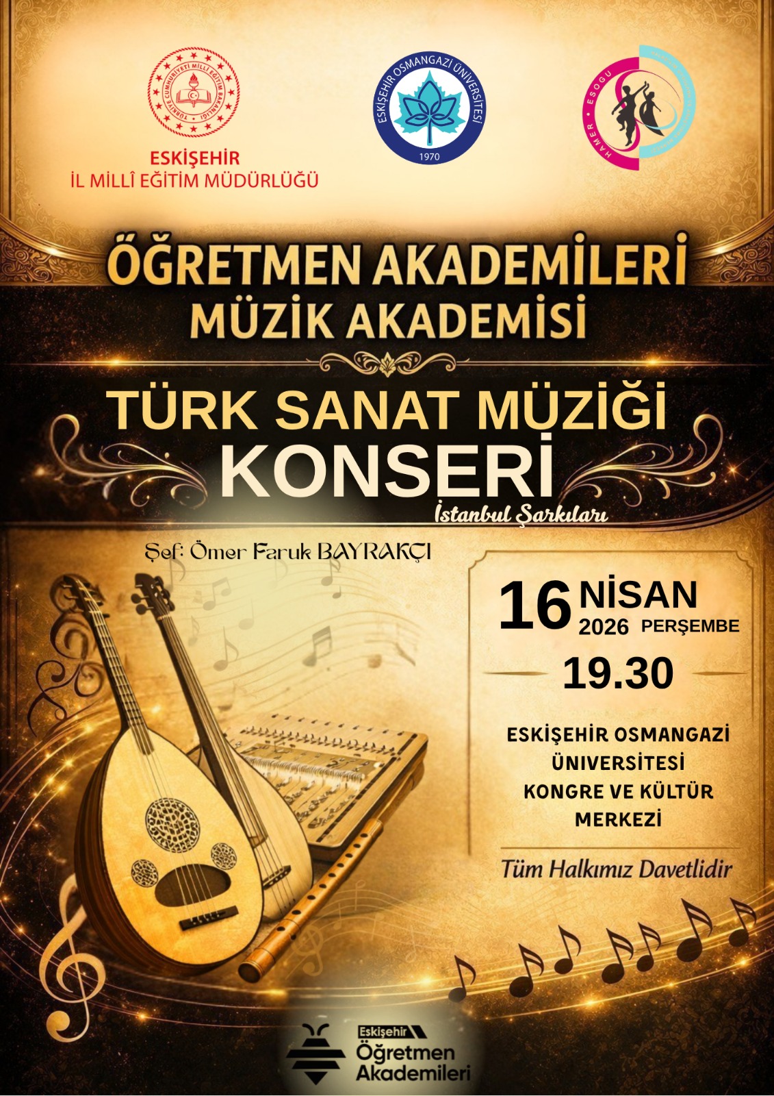 Öğretmen Akademisi ve Esogü Hamer işbirliğiyle hazırlanan Türk Sanat Müziği Korosu İstanbul Şarkıları Konseri 16 Nisan 2026 Salı akşamı saat 19.30'da Esogü Kongre ve Kültür Merkezi'nde gerçekleştirilecektir.